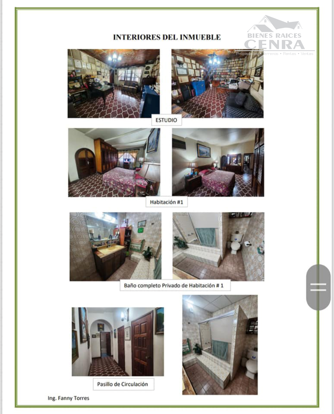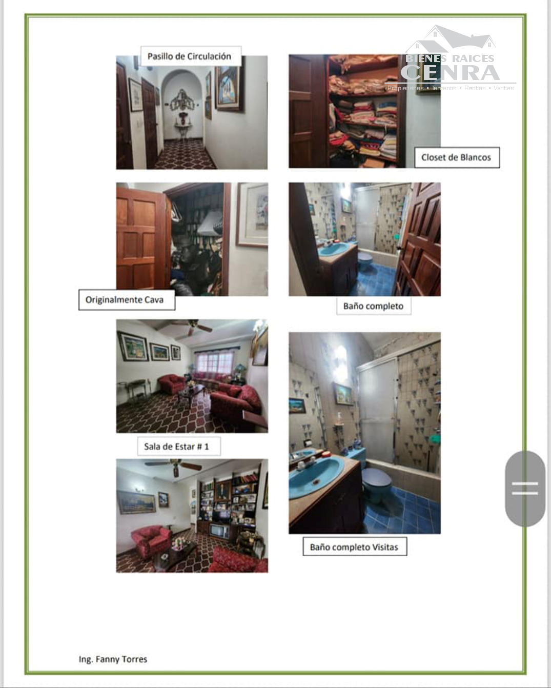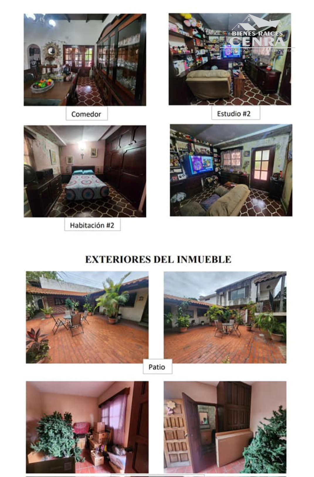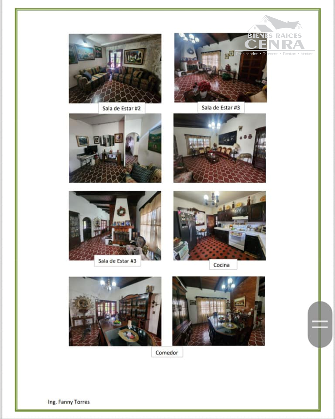 Primer nivel: estudio, una habitación con baño y closet, pasillo interior closet de baño, baño completo para visita, 2 salas y sala principal con chimenea, comedor, cocina amueblada, 2 estudios, 2 habitaciones, 2 parqueos, área de corredores, patio central, dormitorio de huéspedes con baño privado, dormitorio de empleada con baño, bodega, área de lavandería