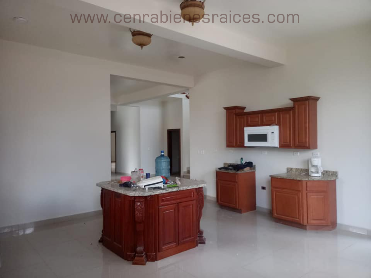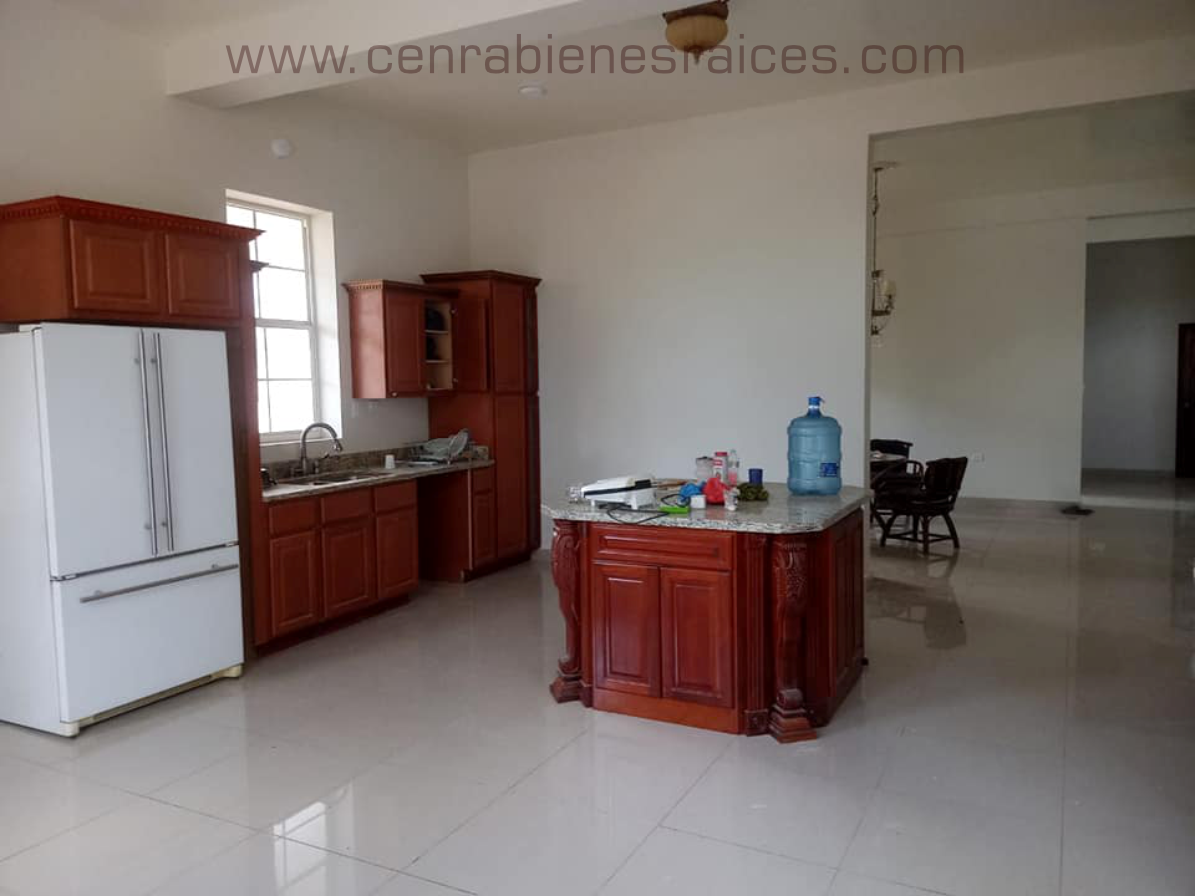 Primer piso: amplio estacionamiento, sala, comedor, cocina amueblada, medio baño de visitas, 2 habitaciones cada una con baño, cuarto de empleada, cisterna, agua caliente, área de lavandería.